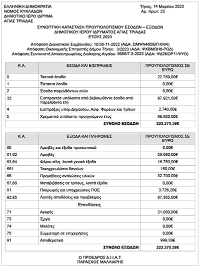 Συνοπτική κατάσταση Προϋπολογισμού εσόδων - εξόδων Δημοτικού Ιερού Ιδρύματος Αγίας Τριάδας έτους 2023 Κείμενο Βλέπε εικόνα. Αριθμός Φύλλου: 6083 Κατηγορία: Προϋπολογισμοί