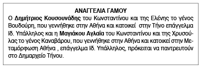 Αναγγελία Γάμου Κουσουνάδη Δημήτριου και Μαγιάκου Αγλαΐας Κείμενο Βλέπε εικόνα. Αριθμός Φύλλου: 6084 Κατηγορία: Αναγγελία Γάμου
