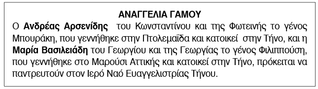 Αναγγελία Γάμου Ανδρέα Αρσενίδη & Μαρίας Βασιλειάδη Κείμενο Βλέπε εικόνα. Αριθμός Φύλλου: 6085 Κατηγορία: Αναγγελία Γάμου