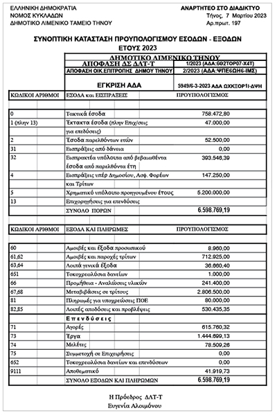 Συνοπτική κατάσταση Προϋπολογισμού εσόδων - εξόδων έτους 2023 από το Δημοτικό Λιμενικό Ταμείο Τήνου Κείμενο Βλέπε εικόνα. Αριθμός Φύλλου: Αριθμός Φύλλου 6085 Κατηγορία: Κατηγορία Προϋπολογισμοί