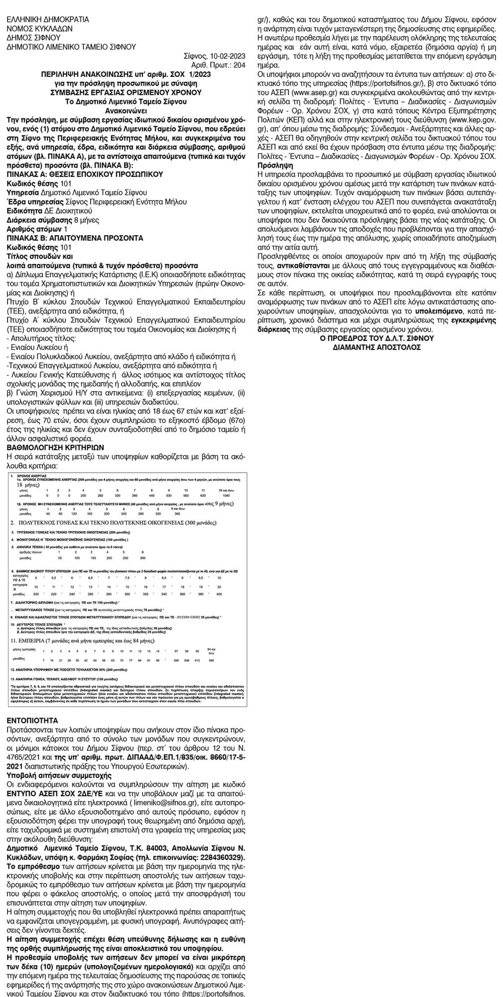 Περίληψη ανακοίνωσης υπ' αριθμ. ΣΟΧ 1/2023 από το Δημοτικό Λιμενικό Ταμείο Σίφνου Κείμενο Βλέπε εικόνα. Αριθμός Φύλλου: Αριθμός Φύλλου 6090 Κατηγορία: Κατηγορία Προκήρυξη Θέσεων