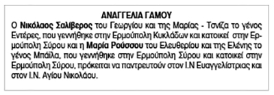 Αναγγελία γάμου Σαλίβερου Νίκου και Ρούσσου Μαρίας Κείμενο Βλέπε εικόνα. Αριθμός Φύλλου: 6092 Κατηγορία: Αναγγελία Γάμου