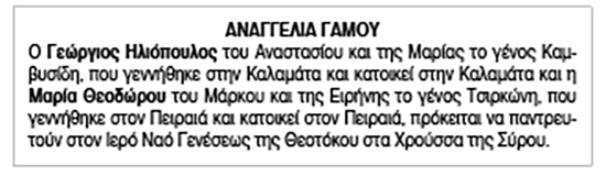 Αναγγελία γάμου Γεώργιου Ηλιόπουλου και Θεοδώρου Μαρίας Κείμενο Βλέπε εικόνα. Αριθμός Φύλλου: 6092 Κατηγορία: Αναγγελία Γάμου
