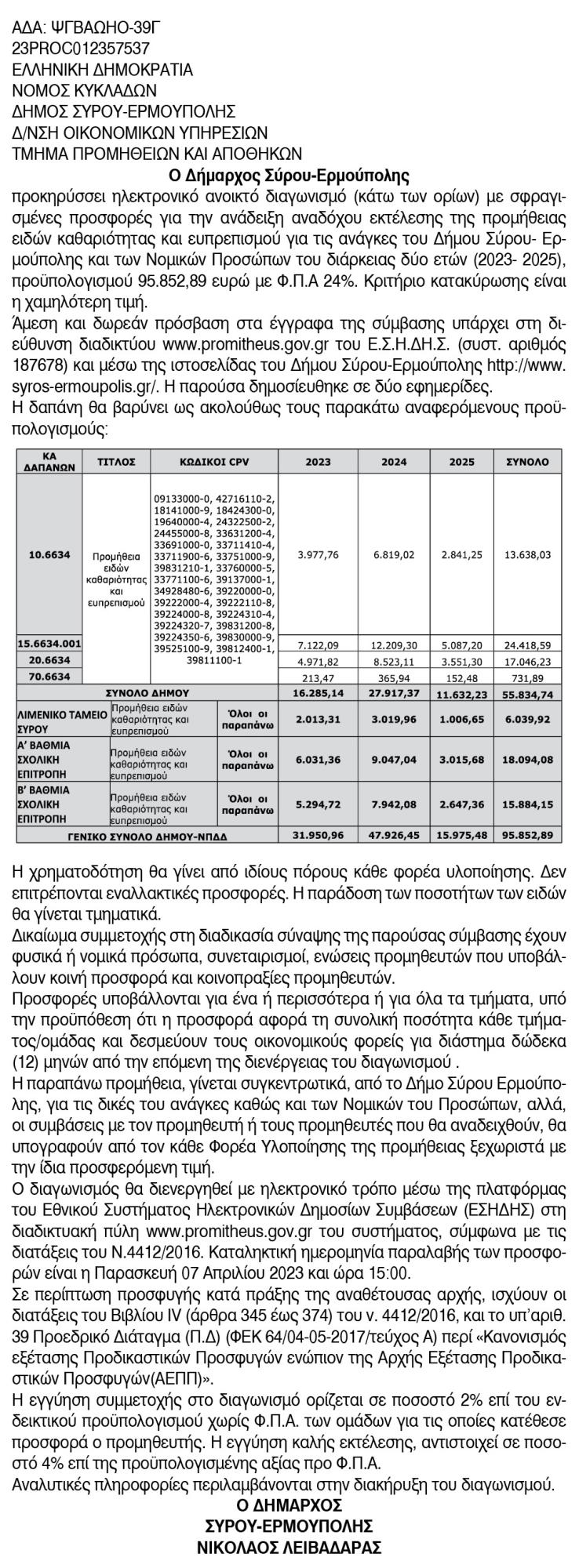 Προμήθεια ειδών καθαριότητας και ευπρεπισμού για τις ανάγκες του Δήμου Σύρου Ερμούπολης και των Νομικών Προσώπων του Κείμενο Βλέπε εικόνα. Αριθμός Φύλλου: Αριθμός Φύλλου 6092 Κατηγορία: Κατηγορία Προκήρυξη Έργων - Δημοπρασίες