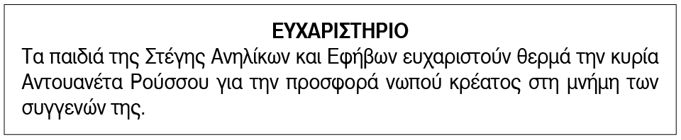 Ευχαριστήριο για Δωρεές από τη Στέγη Ανηλίκων και Εφήβων Σύρου Κείμενο Βλέπε εικόνα. Αριθμός Φύλλου: Αριθμός Φύλλου 6102 Κατηγορία: Κατηγορία Δωρεές