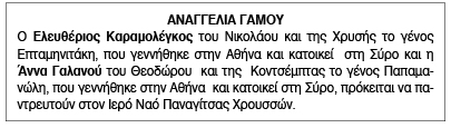 Αναγγελία γάμου για Καραμολέγκο Ελευθέριο και Γαλανού Άννα Κείμενο Βλέπε εικόνα. Αριθμός Φύλλου: 6111 Κατηγορία: Αναγγελία Γάμου