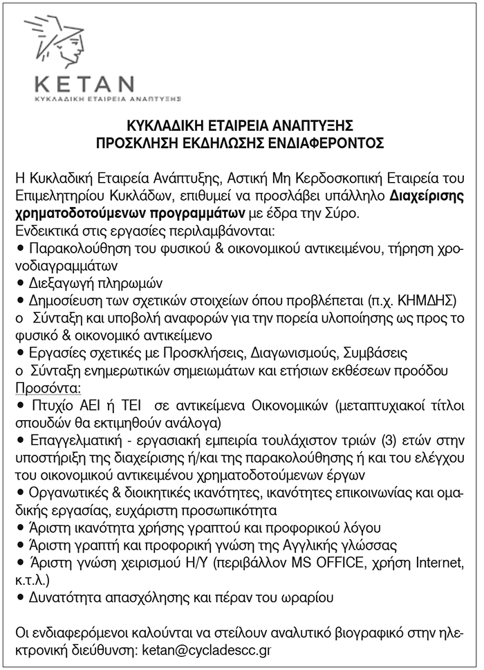 Η Κυκλαδική Εταιρεία Ανάπτυξης, Αστική Μη Κερδοσκοπική Εταιρεία του Επιμελητηρίου Κυκλάδων, επιθυμεί να προσλάβει υπάλληλο Διαχείρισης χρηματοδοτούμενων προγραμμάτων με έδρα την Σύρο.