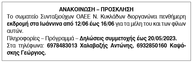 Εκδρομή στα Ιωάννινα από το Σωματείο Συνταξιούχων ΟΑΕΕ Ν. Κυκλάδων Κείμενο Βλέπε εικόνα. Αριθμός Φύλλου: 6123 Κατηγορία: Ανακοίνωση