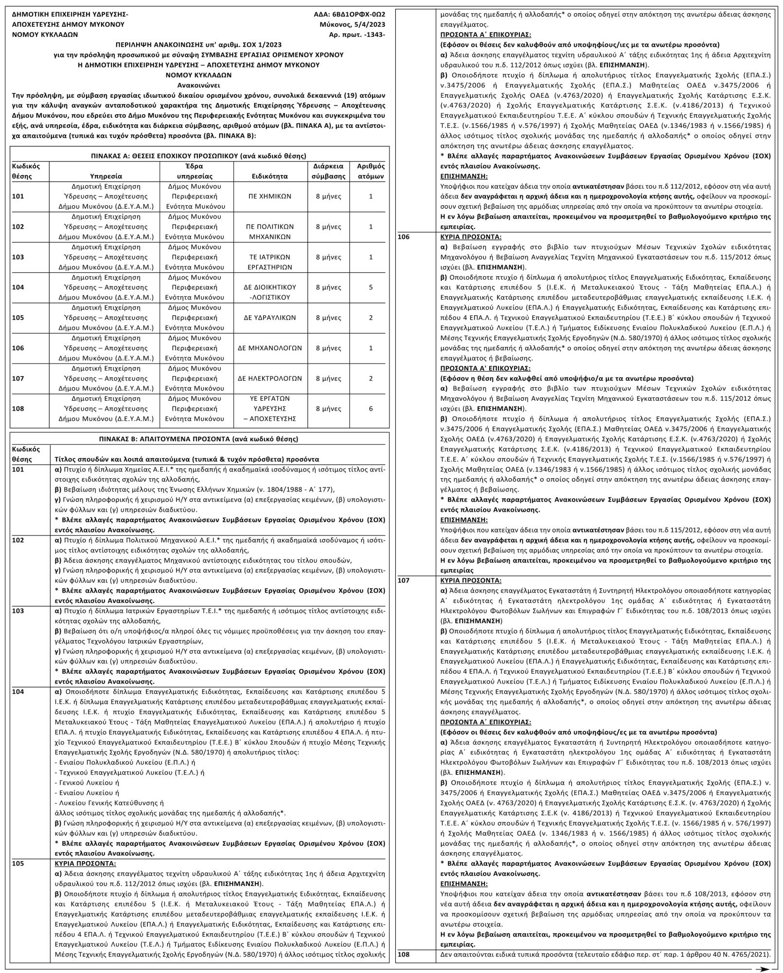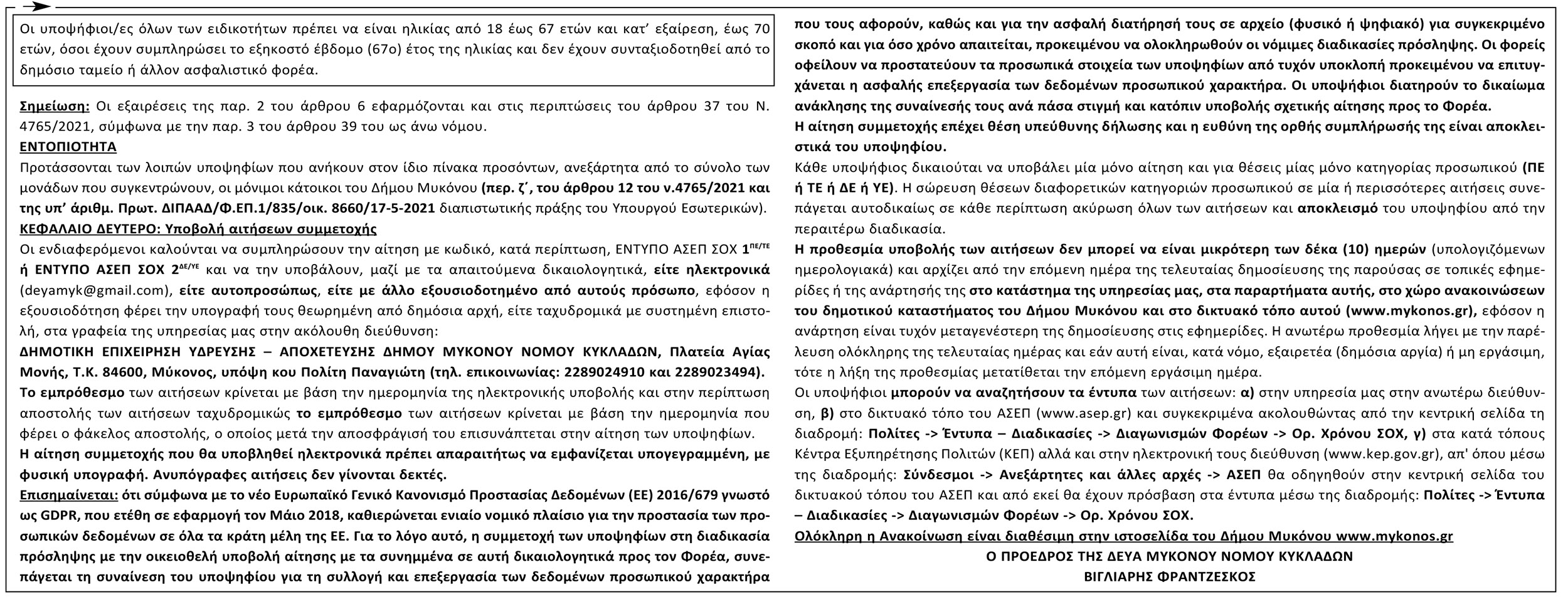 Περίληψη Ανακοίνωσης υπ' αριθμ. ΣΟΧ 1/2023 από τη Δημοτική Επιχείρηση Ύδρευσης Αποχέτευσης Δήμου Μυκόνου Κείμενο Βλέπε εικόνα. Αριθμός Φύλλου: Αριθμός Φύλλου 6127 Κατηγορία: Κατηγορία Προκήρυξη Θέσεων