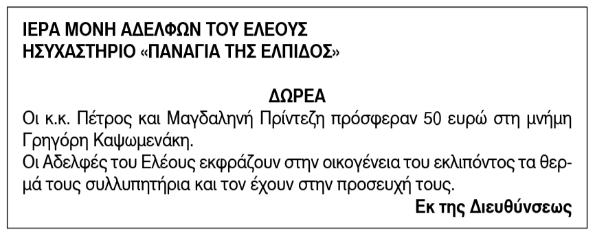Ευχαριστήριο για δωρεές από την Ιερά Μονή Αδελφών του Ελέους Ησυχαστήριο "Παναγία της Ελπίδος" Κείμενο Βλέπε εικόνα. Αριθμός Φύλλου: 6128 Κατηγορία: Δωρεές