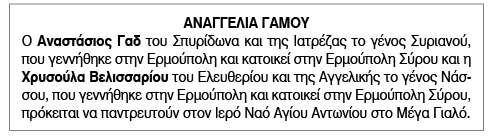 Αναγγελία Γάμου για Αναστάσιο Γαδ και Χρυσούλα Βελισσαρίου Κείμενο Βλέπε εικόνα. Αριθμός Φύλλου: 6129 Κατηγορία: Αναγγελία Γάμου