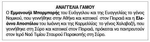 Αναγγελία Γάμου για Εμμανουήλ Μπαρμπαρή και Ελεάννα Αποστόλου Κείμενο Βλέπε εικόνα. Αριθμός Φύλλου: 6129 Κατηγορία: Αναγγελία Γάμου