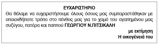 Ευχαριστήριο για Πιτσικάλη Ν. Γεώργιο Κείμενο Βλέπε εικόνα. Αριθμός Φύλλου: 6130 Κατηγορία: Ευχαριστήριο