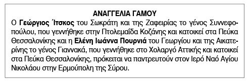 Αναγγελία γάμου για Γεώργιο Ίτσκο και Ελένη Ιωάννα Πουρνιά Κείμενο Βλέπε εικόνα. Αριθμός Φύλλου: 6135 Κατηγορία: Αναγγελία Γάμου