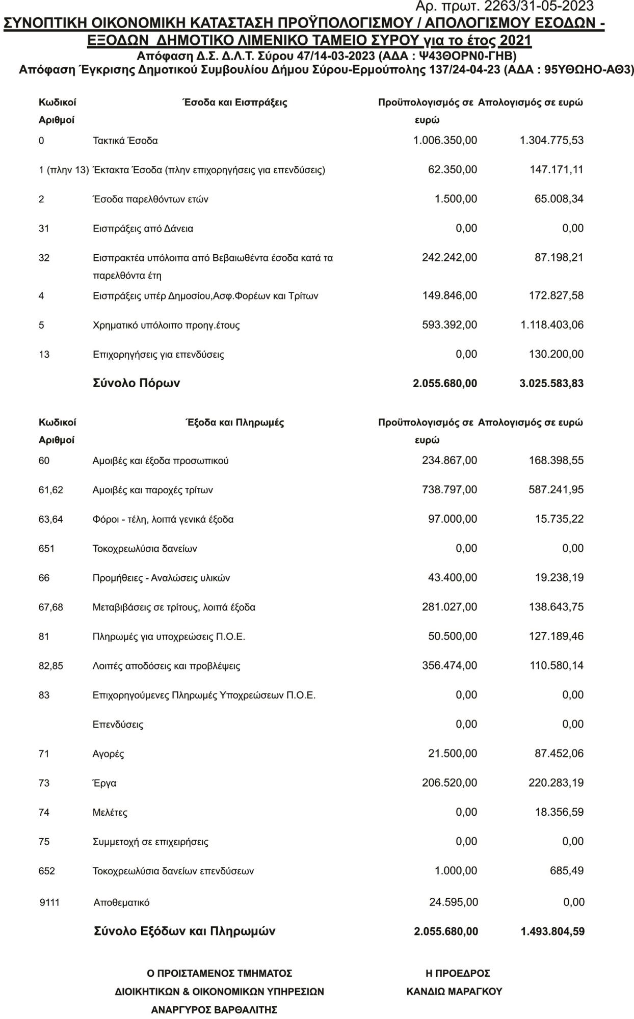 Συνοπτική οικονομική κατάσταση Προϋπολογισμου/Απολογισμού εσόδων - εξόδων από το Δημοτικό Λιμενικό Ταμείο Σύρου για το έτος 2021 Κείμενο Βλέπε εικόνα. Αριθμός Φύλλου: 6136 Κατηγορία: Προϋπολογισμοί