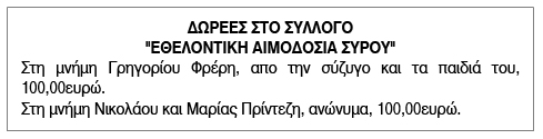 Ευχαριστήριο για δωρεές από το Σύλλογο Εθελοντικής Αιμοδοσίας Σύρου Κείμενο Βλέπε εικόνα. Αριθμός Φύλλου: 6142 Κατηγορία: Δωρεές