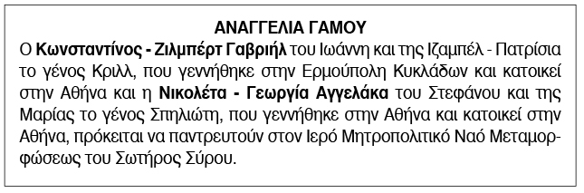 Αναγγελία γάμου για Κωνσταντίνο - Ζιλμπέρτ Γαβριήλ και Νικολέτα - Γεωργία Αγγελάκα Κείμενο Βλέπε εικόνα. Αριθμός Φύλλου: 6146 Κατηγορία: Αναγγελία Γάμου