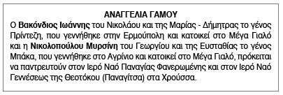 Αναγγελία Γάμου για Βακόνδιο Ιωάννη και Νικολοπούλου Μυρσίνη Κείμενο Βλέπε εικόνα. Αριθμός Φύλλου: 6148 Κατηγορία: Αναγγελία Γάμου