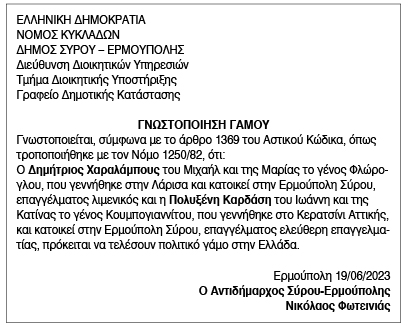 Γνωστοποίηση Γάμου για Δημήτριο Χαραλάμπους και Πολυξένη Καρδάση Κείμενο Βλέπε εικόνα. Αριθμός Φύλλου: 6148 Κατηγορία: Γνωστοποίηση Γάμου