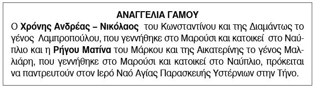 Αναγγελία γάμου για Χρόνη Ανδρέα - Νικόλαο και Ρήγου Ματίνα Κείμενο Βλέπε εικόνα. Αριθμός Φύλλου: Αριθμός Φύλλου 6598 Κατηγορία: Κατηγορία Αναγγελία Γάμου