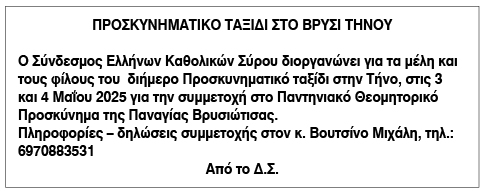 Προσκυνηματικό ταξίδι στο Βρυσί Τήνου, από τον Σύνδεσμο Ελλήνων Καθολικών Σύρου Κείμενο Βλέπε εικόνα. Αριθμός Φύλλου: 6599 Κατηγορία: Ανακοίνωση