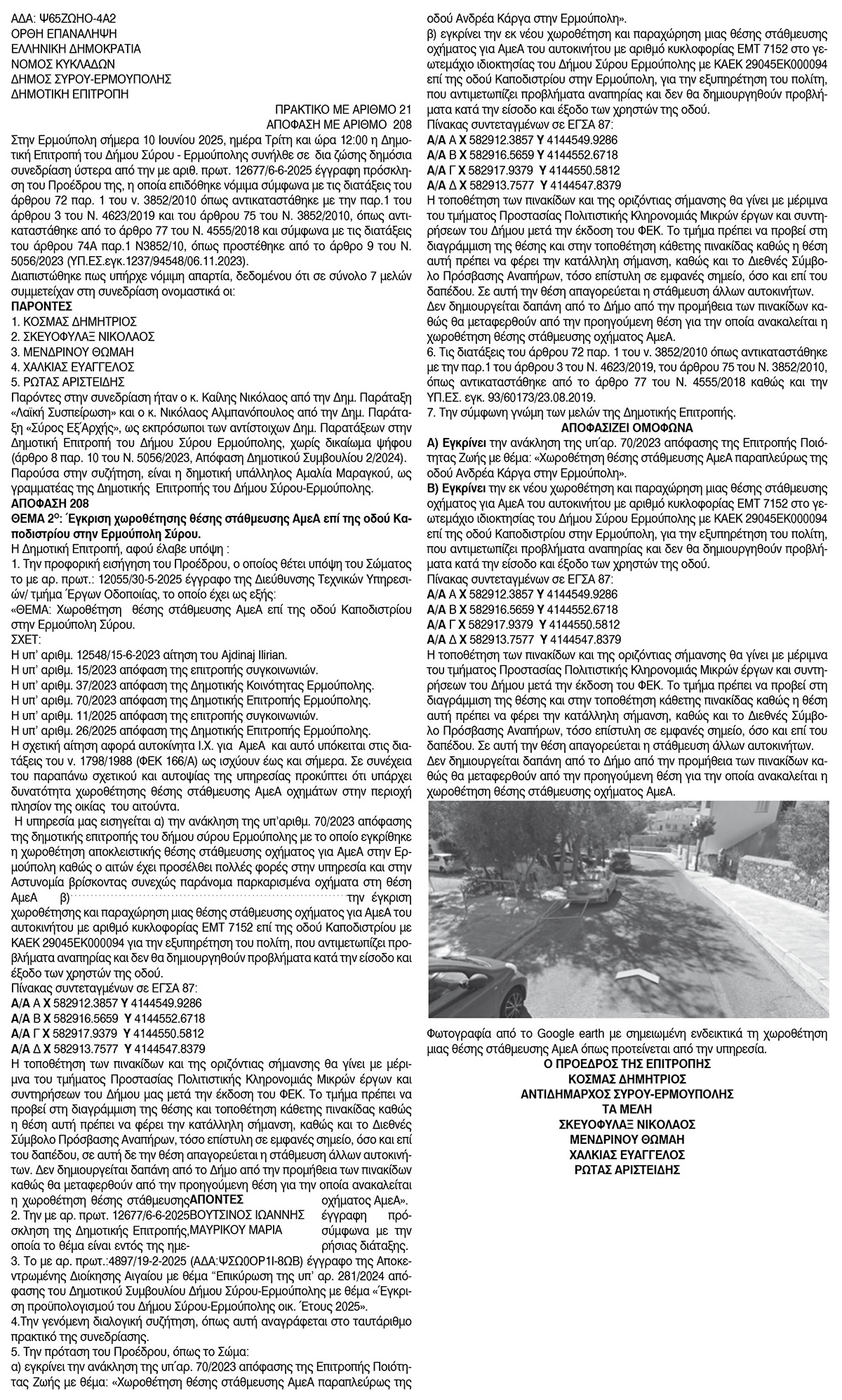 Χωροθέτηση θέσης στάθμευσης ΑμεΑ παραπλεύρως της οδού Ανδρέα Κάργα στην Ερμούπολη, από το Δήμο Σύρου Ερμούπολης Κείμενο Βλέπε εικόνα. Αριθμός Φύλλου: Αριθμός Φύλλου 6647 Κατηγορία: Κατηγορία Απόφαση