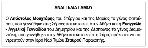 Αναγγελία γάμου για Απόστολο Μουχτάρη και Ευαγγελία - Αγγελική Γενναδίου Κείμενο Βλέπε εικόνα. Αριθμός Φύλλου: Αριθμός Φύλλου 6648 Κατηγορία: Κατηγορία Αναγγελία Γάμου