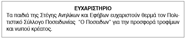 Ευχαριστήριο για δωρεές από τη Στέγη Ανηλίκων Σύρου Κείμενο Βλέπε εικόνα. Αριθμός Φύλλου: Αριθμός Φύλλου 6654 Κατηγορία: Κατηγορία Δωρεές