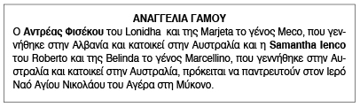 Αναγγελία γάμου για Αντρέα Φισέκου και Samantha Ienco Κείμενο Βλέπε εικόνα. Αριθμός Φύλλου: Αριθμός Φύλλου 6660 Κατηγορία: Κατηγορία Αναγγελία Γάμου