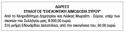Ευχαριστήριο για δωρεές από το Σύλλογο Εθελοντικής Αιμοδοσίας Σύρου Κείμενο Βλέπε εικόνα. Αριθμός Φύλλου: Αριθμός Φύλλου 6660 Κατηγορία: Κατηγορία Δωρεές