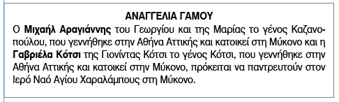 Αναγγελία γάμου για Μιχαήλ Αραγιάννη και Γαβριέλα Κότσι Κείμενο Βλέπε εικόνα. Αριθμός Φύλλου: Αριθμός Φύλλου 6663 Κατηγορία: Κατηγορία Αναγγελία Γάμου