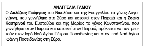 Αναγγελία γάμου για Δαλέζιο Γεώργιο και Σοφία Καστρινού Κείμενο Βλέπε εικόνα. Αριθμός Φύλλου: Αριθμός Φύλλου 6665 Κατηγορία: Κατηγορία Αναγγελία Γάμου