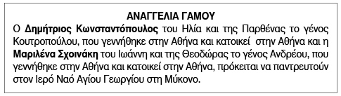 Αναγγελία γάμου για Κωνσταντόπουλο Δημήτριο και Μαριλένα Σχοινάκη Κείμενο Βλέπε εικόνα. Αριθμός Φύλλου: Αριθμός Φύλλου 6666 Κατηγορία: Κατηγορία Αναγγελία Γάμου
