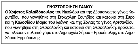 Γνωστοποίηση γάμου για Χρήστο Καλαϊδόπουλο και Καλοσίδου Μαρία Κείμενο Βλέπε εικόνα. Αριθμός Φύλλου: 6667 Κατηγορία: Γνωστοποίηση Γάμου
