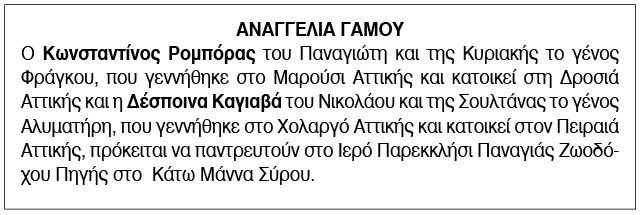 Αναγγελία γάμου για Κωνσταντίνο Ρομπόρα και Δέσποινα Καγιαβά Κείμενο Βλέπε εικόνα. Αριθμός Φύλλου: Αριθμός Φύλλου 6670 Κατηγορία: Κατηγορία Αναγγελία Γάμου