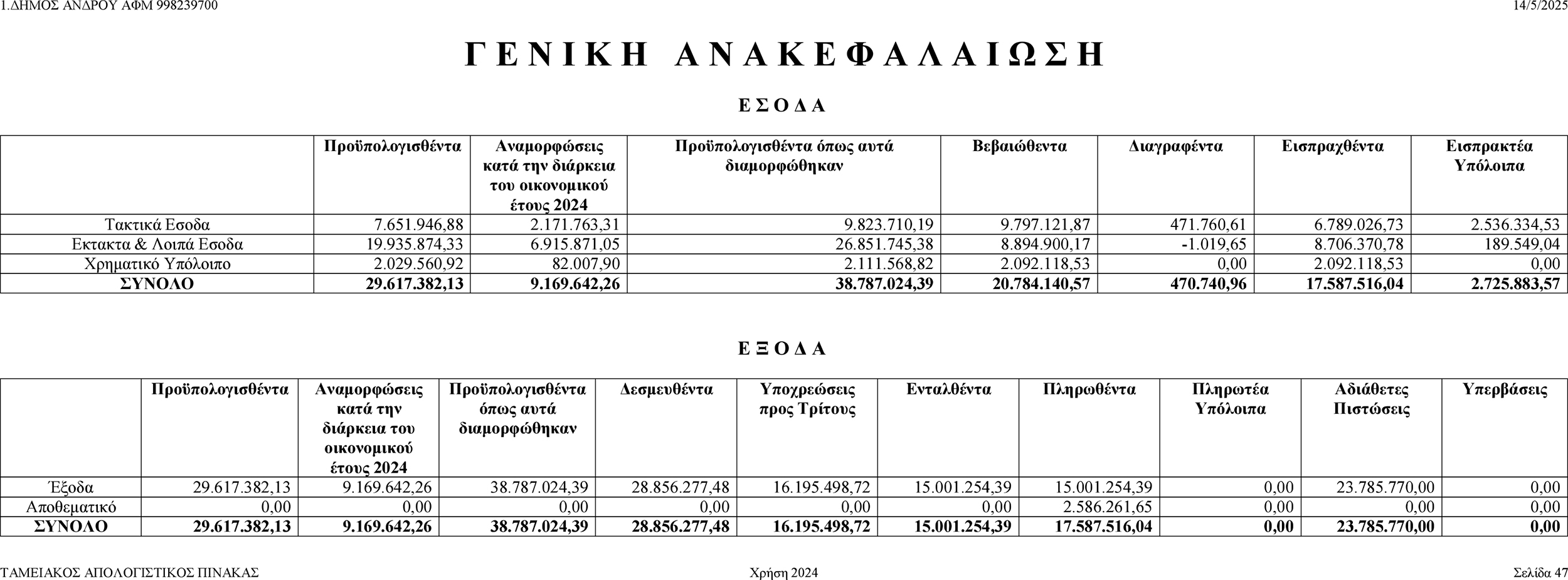 Γενική ανακεφαλαίωση Απολογισμού Δήμου Άνδρου έτους 2024, από το Δήμο Άνδρου Κείμενο Βλέπε εικόνα. Αριθμός Φύλλου: Αριθμός Φύλλου 6673 Κατηγορία: Κατηγορία Απολογισμός