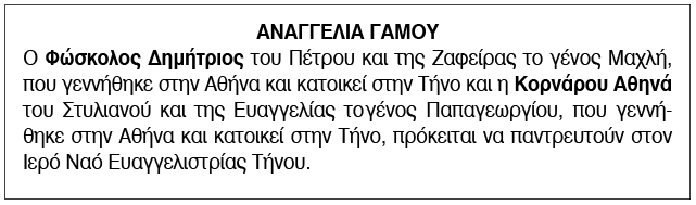 Αναγγελία γάμου για Φώσκολο Δημήτριο και Κορνάρου Αθηνά Κείμενο Βλέπε εικόνα. Αριθμός Φύλλου: Αριθμός Φύλλου 6677 Κατηγορία: Κατηγορία Αναγγελία Γάμου