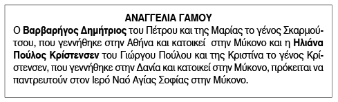 Αναγγελία γάμου για Βαρβαρήγο Δημήτριο και Ηλιάνα Πούλος Κρίστενσεν Κείμενο Βλέπε εικόνα. Αριθμός Φύλλου: Αριθμός Φύλλου 6678 Κατηγορία: Κατηγορία Αναγγελία Γάμου