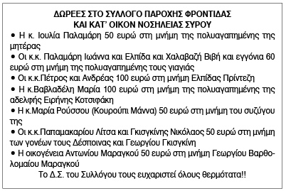 Ευχαριστήριο για δωρεές από το Σύλλογο Κατ' Οίκον Νοσηλείας Σύρου Κείμενο Βλέπε εικόνα. Αριθμός Φύλλου: Αριθμός Φύλλου 6681 Κατηγορία: Κατηγορία Δωρεές