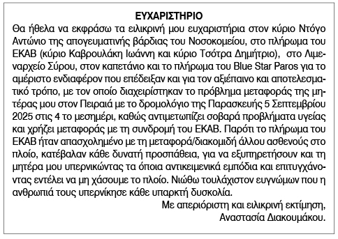 Ευχαριστήριο προς το Νοσοκομείο από την κυρία Διακουμάτου Κείμενο Βλέπε εικόνα. Αριθμός Φύλλου: Αριθμός Φύλλου 6686 Κατηγορία: Κατηγορία Ευχαριστήριο
