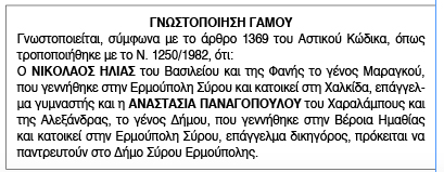 Γνωστοποίηση γάμου για Νικόλαο Ηλία και Παναγοπούλου Αναστασία Κείμενο Βλέπε εικόνα. Αριθμός Φύλλου: Αριθμός Φύλλου 6698 Κατηγορία: Κατηγορία Γνωστοποίηση Γάμου