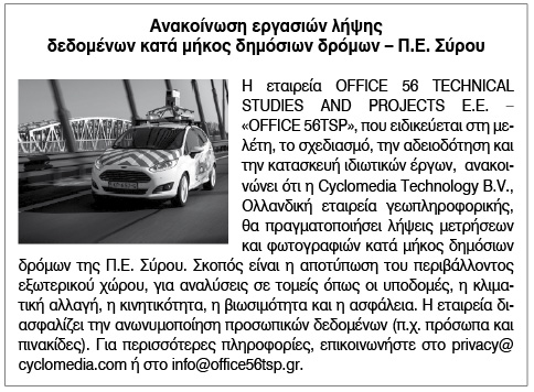 Ανακοίνωση εργασιών λήψης δεδομένων κατά μήκος δημόσιων δρόμων Π.Ε. Σύρου Κείμενο Βλέπε εικόνα. Αριθμός Φύλλου: Αριθμός Φύλλου 6701 Κατηγορία: Κατηγορία Ανακοίνωση