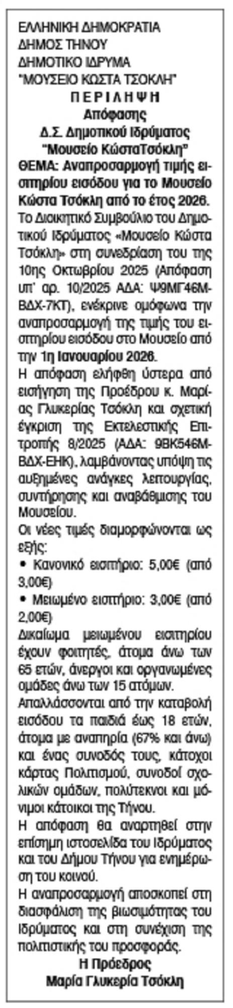 Αναπροσαρμογή τιμής εισιτηρίου εισόδου για το Μουσείο Κώστα Τσόκλη από το έτος 2026 Κείμενο Βλέπε εικόνα. Αριθμός Φύλλου: Αριθμός Φύλλου 6716 Κατηγορία: Κατηγορία Περιλήψεις
