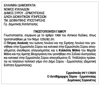 Γνωστοποίηση γάμου για Πέτρο Λουλού και Καλλιόπη Μάϊνα Κείμενο Βλέπε εικόνα. Αριθμός Φύλλου: Αριθμός Φύλλου 6720 Κατηγορία: Κατηγορία Γνωστοποίηση Γάμου