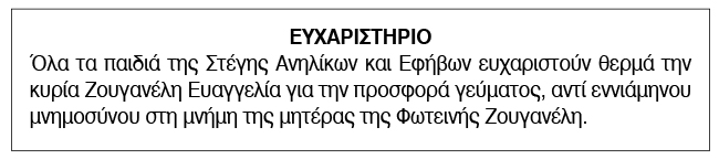Ευχαριστήριο για δωρεές από τη στέγη Ανηλίκων και Εφήβων Σύρου Κείμενο Βλέπε εικόνα. Αριθμός Φύλλου: Αριθμός Φύλλου 6721 Κατηγορία: Κατηγορία Δωρεές