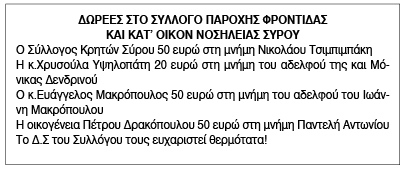 Ευχαριστήριο για δωρεές από το Σύλλογο Κατ' Οίκον Νοσηλείας Σύρου Κείμενο Βλέπε εικόνα. Αριθμός Φύλλου: Αριθμός Φύλλου 6724 Κατηγορία: Κατηγορία Δωρεές