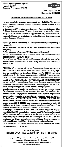Περίληψη ανακοίνωσης υπ' αριθμ. ΣΟΧ 2/2025, από την ΔΕΔΔΗΕ περιοχή Σύρου Κείμενο Βλέπε εικόνα. Αριθμός Φύλλου: Αριθμός Φύλλου 6726 Κατηγορία: Κατηγορία Προκήρυξη Θέσεων