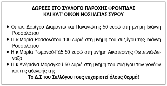Ευχαριστήριο για δωρεές από την Κατ' Οίκον Νοσηλεία Σύρου Κείμενο Βλέπε εικόνα. Αριθμός Φύλλου: Αριθμός Φύλλου 6731 Κατηγορία: Κατηγορία Δωρεές