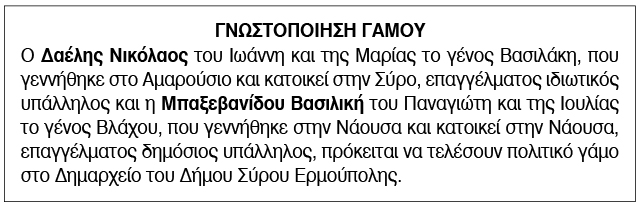 Γνωστοποίηση γάμου για Δαέλη Νικόλαο και Μπαξεβανίδου Βασιλική Κείμενο Βλέπε εικόνα. Αριθμός Φύλλου: Αριθμός Φύλλου 6745 Κατηγορία: Κατηγορία Γνωστοποίηση Γάμου