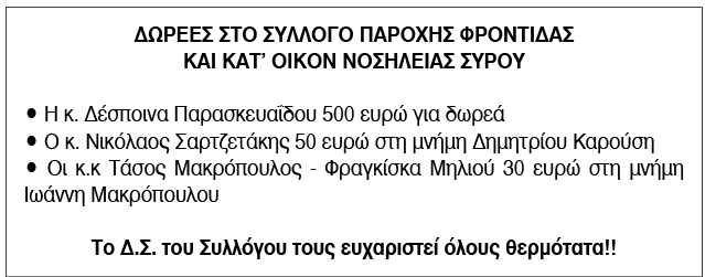 Ευχαριστήριο για δωρεές από την Κατ' Οίκον Νοσηλεία Σύρου Κείμενο Βλέπε εικόνα. Αριθμός Φύλλου: Αριθμός Φύλλου 6749 Κατηγορία: Κατηγορία Δωρεές